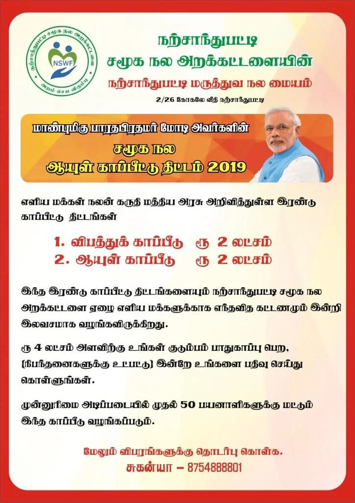 One of the projects identified by NSWF is to support the following insurance based welfare schemes introduced by our Honble PM Modi: • Pradhan Mantri Suraksha Bima Yojana. This is basically a Personal Accident insurance policy providing personal accident cover for Rs.2 lakhs, for an annual premium of just Rs.12. • Pradhan Mantri Jeevan Jyoti Bima Yojana. This is basically a Term Life insurance policy providing life insurance cover for Rs.2 lakhs, for an annual premium of just Rs 330. • For a cost of just Rs.342 per annum, insurance coverage of Rs.4 lakhs can be obtained under the scheme. We want to help at least 100 less fortunate people in our area to obtain this coverage. The project cost is Rs.25,000. For the year 2019, NSWF arranged 72 Personal Accident policies at a cost of Rs.864. NSWF also arranged 42 Life Insurance policies at a cost of Rs.13,860. These policies are due for renewal by end May 2020. NSWF would like to help in the renewal of policies and add some more deserving cases. During 2019, a claim of Rs.2 lakhs was succesfully received for an unfortunate victim. Though a life cannot be replaced, this Rs.2 lakhs received from insurance helped the family to overcome their immediate financial needs. We call upon the kind hearted Donors for 2019 and other well wishers to participate in this year's project. Please remember: Every Rs.1,000 contribution by any one of us can help three families. Those of you interested to contribute Rs.1,000 or more can get in touch with us ENJOY THE JOY OF GIVING!